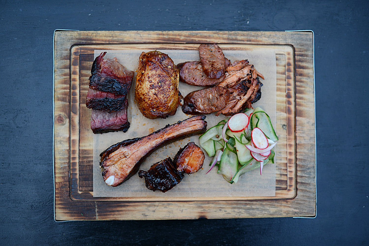 It didn’t take long to get patched up and we soon arrived at Hotbox, an effortlessly cool new meaty restaurant with red lights, straight lines and dark furniture. The staff were lovely and greeted us on arrival with prosecco, then duly topped us up with cocktails and wine.